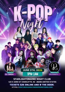 Join us for an awesome in-person event where you can vibe to the best K-Pop hits, meet fellow fans, and maybe even show off your dance moves! Whether you’re a longtime fan or just curious, this night is all about fun, music, and good vibes. Don’t miss out on an epic evening full of energy and great tunes. See you there!